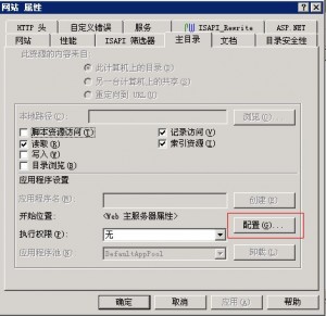打開IIS 6管理器,在"網(wǎng)站"上點右鍵-->屬性-->主目錄-->配置-->添加,,操作方式就不詳寫了,繼續(xù)上圖