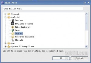 啟動(dòng)Eclipse,在Window->Show View會(huì)出來(lái)一個(gè)對(duì)話框,當(dāng)我們點(diǎn)擊Ok按鈕時(shí),會(huì)在控制臺(tái)窗口出現(xiàn)LogCat視窗.如下圖: